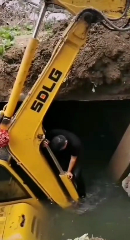 可以看到挖機的破碎錘當時正在敲擊山坡山的巖石,隨后石塊墜落,但是沒想到連帶著后面一塊更大的巨石墜落下來,而挖掘機還沒來得及反應,就被砸到了小