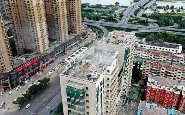 牛!洛陽4臺挖掘機攀爬到60米高樓頂施工作業